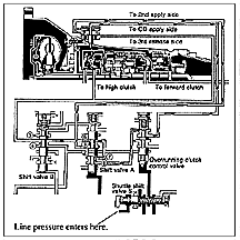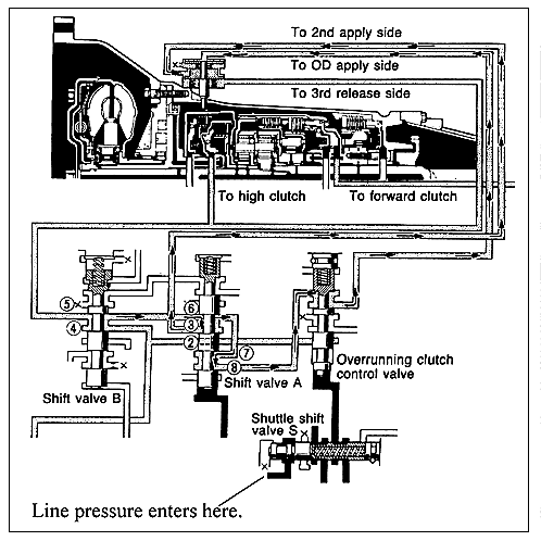 There are several different reasons that one of these units may not get fourth gear-reasons both inside and outside of the transmission. However, one of the stranger causes of no fourth gear is insufficient line pressure, or no line pressure rise with throttle. This has to do with the function of shuttle shift valve S in the valve body, but more on that later.