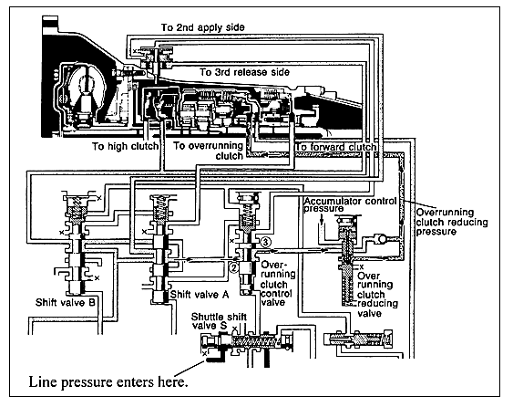 For this valve to move into the unblocking position, line pressure must rise above minimum line-typically over 100 psi. This increase in pressure moves shuttle shift valve S against its spring, shifting the overrun clutch control valve, which will now allow fourth gear apply oil to reach the servo, and shift the unit into fourth gear (Figure 2).