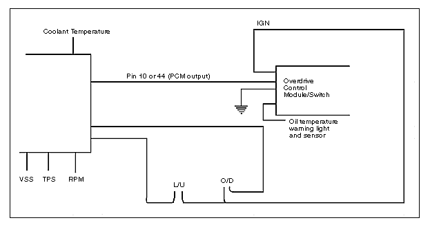 The Dodge pickup looked like it used the second type system as shown in figure two. Closer scrutiny of the second type system revealed that information from the coolant sensors, TPS, VSS, engine rpm signal, overdrive switch (or overdrive cancel module) is required for fourth gear to operate. Some models also have a transmission oil temperature sensor which prevents fourth gear if the ATF exceeds 270° Fahrenheit. In order for the PCM to allow fourth gear, the engine coolant temperature must be at least 65° Fahrenheit. The overdrive cancel switch module must be on, the VSS must indicate at least 25 MPH and the TPS must indicate above idle and less than 70 percent open.