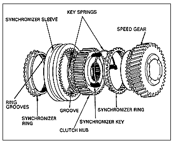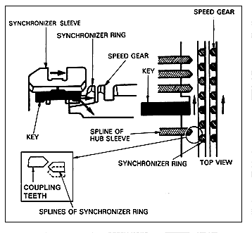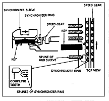 The driver releases the throttle and presses the clutch. Now the driver moves the shift lever, and the shift fork moves the synchronizer sleeve to a neutral position. The detents and interlocks hold the shift mechanism in a neutral position while the driver selects another gear. As the shift fork moves the synchro sleeve toward the chosen gear, the synchronizer keys (sometimes called struts or dogs) move forward with the sleeve and push the synchronizer ring onto the cone of the speed gear (figure 1). Friction develops between the synchronizer ring and the cone of the speed gear, slowing the gear or speeding it up to match the speed of the shaft that the synchronizer is splined to.