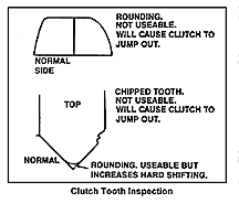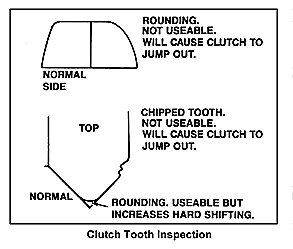 Check the points on the coupling teeth. Damage to the points on the synchronizer sleeve will have matching damage to the points on the speed gear. Reject any gear with rounded or fractured coupling teeth (figure 4). Inspect the side of the coupling teeth for wear or loss of back taper.