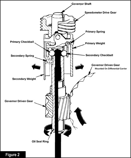 1. On governors where a secondary spring holds the secondary valve outward, away from output shaft or center of governor (typical C4/C6 style, figure 3): Increasing spring tension increases governor pressure at any given speed, causing earlier shifts and less-sensitive kickdown shifts. The unit will shift out of kickdown at lower speeds.