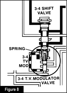 In the examples shown in figures seven and eight, zero-to-very light TV pressure is completely blocked by the modifier valves. As TV pressure rises higher, it forces the valve to move, allowing some TV pressure past the valve. The amount of oil pressure blocked, or stepped down, by these valves is one of the variable characteristics of the valve, and one of the areas you can adjust for a certain effect. Throughout the entire throttle pressure range, the modified pressure will always be lower than TV pressure by that same "stepped down" amount.