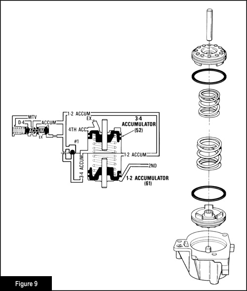 One of the easiest areas to modify to change shift feel is the accumulator piston spring or springs (figure 9). To make a shift firmer, slow down the travel speed of the accumulator piston. To soften a shift, speed up the accumulator piston.