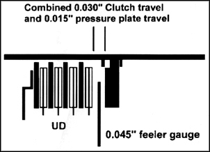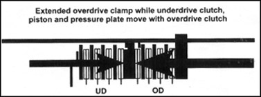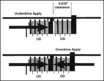 When the shifter is placed in OD at a stop, the UD clutch applies for 1st gear. This takes up both the UD clearance of 0.030" and the pressure plate travel of 0.015". Since piston travel is the full 0.045", the unit engages normally.