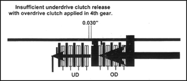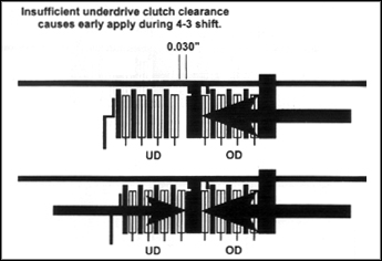 During a 3-4 shift, the OD clutch remains applied. Meanwhile, the UD clutch must release and the 2-4 clutch must apply in a timed, orderly fashion. But the UD/OD pressure plate is now against the bottom snap ring, bringing UD clearance down to the initial 0.030" clutch travel. The clutch won't release as quickly or completely as it should, resulting in a dragging or binding 3-4 shift feel (figure 5). Hold on, we're not through with this yet.