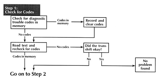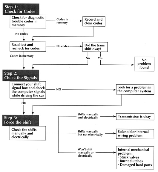 This chart provides a basic diagnostic path to follow when diagnosing nearly any computer-controlled transmission. We'll take a look at how to perform each step, and see what the results of each step indicates.