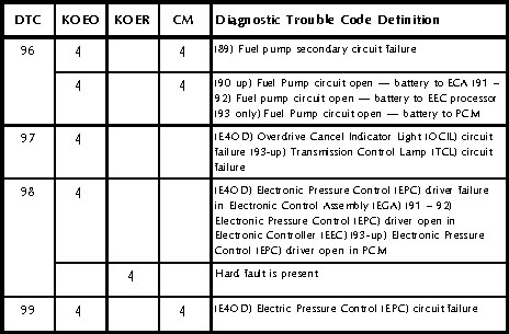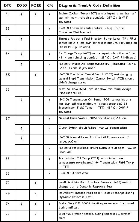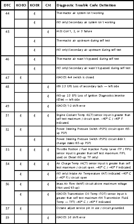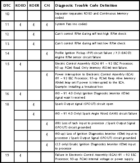 The charts on the next few pages provide all of the diagnostic trouble codes for Ford vehicles, up to the introduction of OBD-II. Many of these codes vary their definition, depending on vehicle year or model. If you aren’t sure what condition one of these codes indicates, always check your shop manual for the specific year, make and model vehicle you’re working on.